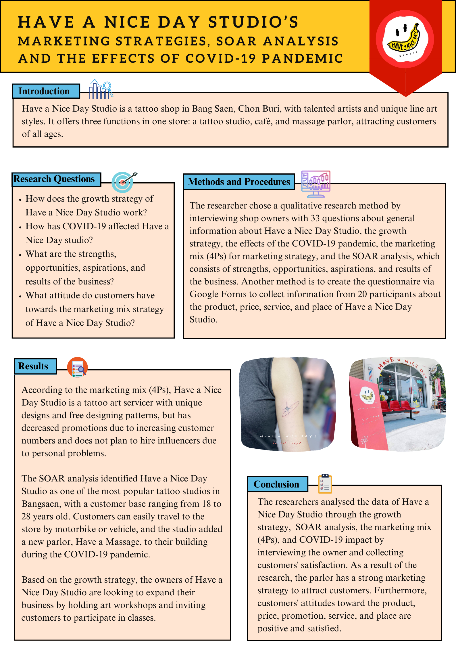This case study is a part of Case Studies in Business class. I'm the one of research team. The researchers conducted the case study to analyze growth strategy and SOAR strategy of Have a Nice Day Studio, one of well-known parlor in Bang Saen,Chonburi. Furthermore, the researchers studied the effects of the COVID-19 pandemic on the business by interviewing the owner. There were 37 questions to analyze our purposes of the study throughout interviewing. As the consequence, this study discovered through the interview that the business has the great strengths and uniqueness so they do not need to offer more promotion andpromote the business. They have a plan to expand the business in the term ofarea and provide more workshop activities. This case study also explored existing customers' opinions towards the marketing mix strategy (4Ps) of the business by using Google Form to contemplate satisfaction of 20 customers. The questionnaire consisted of 2 parts including general information and customer’s attitudes toward the business. As the result, the majority of responding participants were positive. Customers were satisfied with the product, price, promotion, place, and service of the business. The researchers provided recommendations for the study and business. Therefore, this study will bevaluable and useful for the business and future research which relates to this industry.