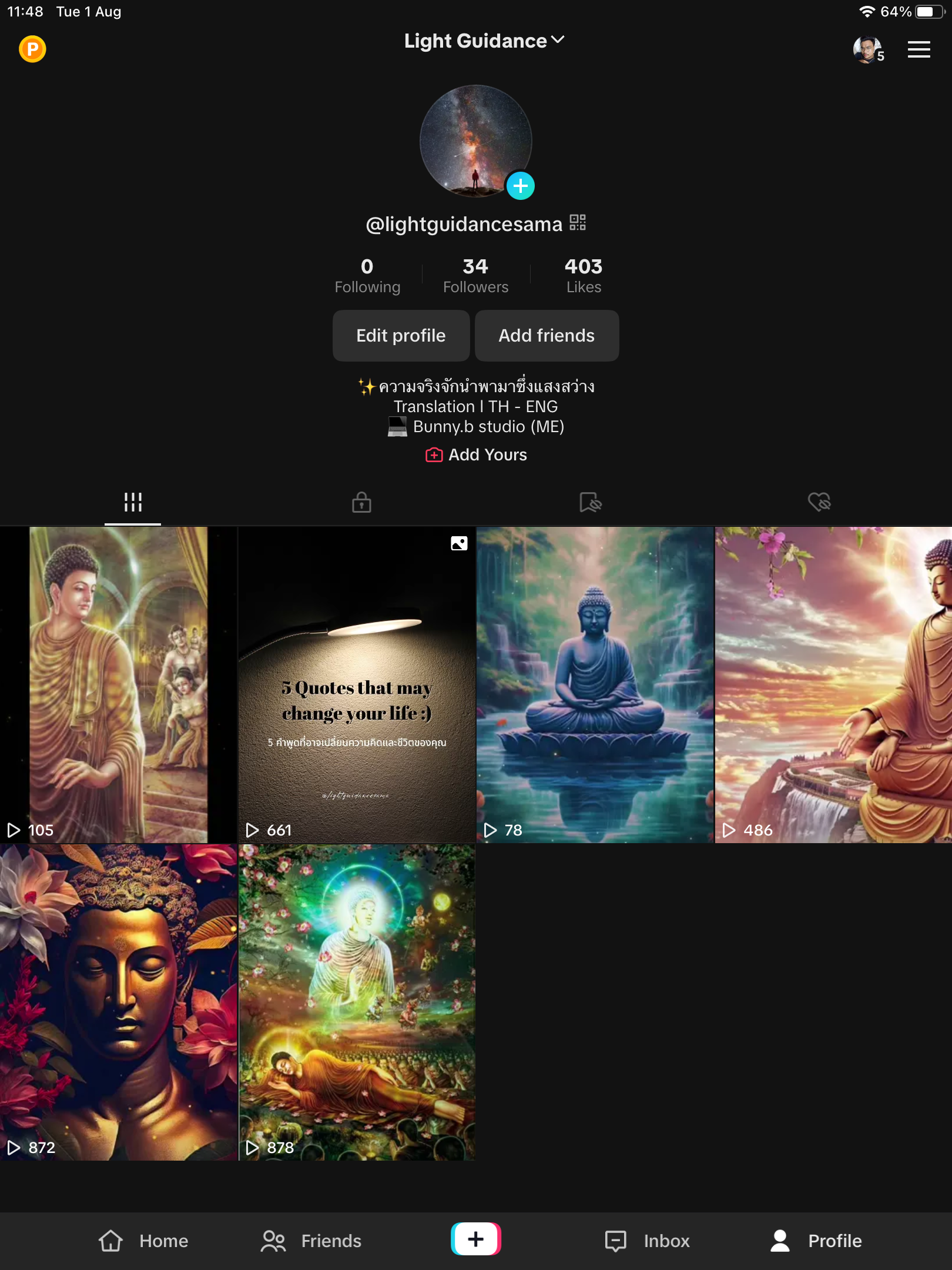 I launched a TikTok channel named Light Guidance (@lightguidancesama). I have intentions to show the truth of life to be a guiding light for everyone to be transcended from suffering, encourage them without discrimination and share positive energy. I create a video and practice my English by translating the content as subtitles. Some photos on videos were created under Bunny.b Studio which is my studio for creating art works.